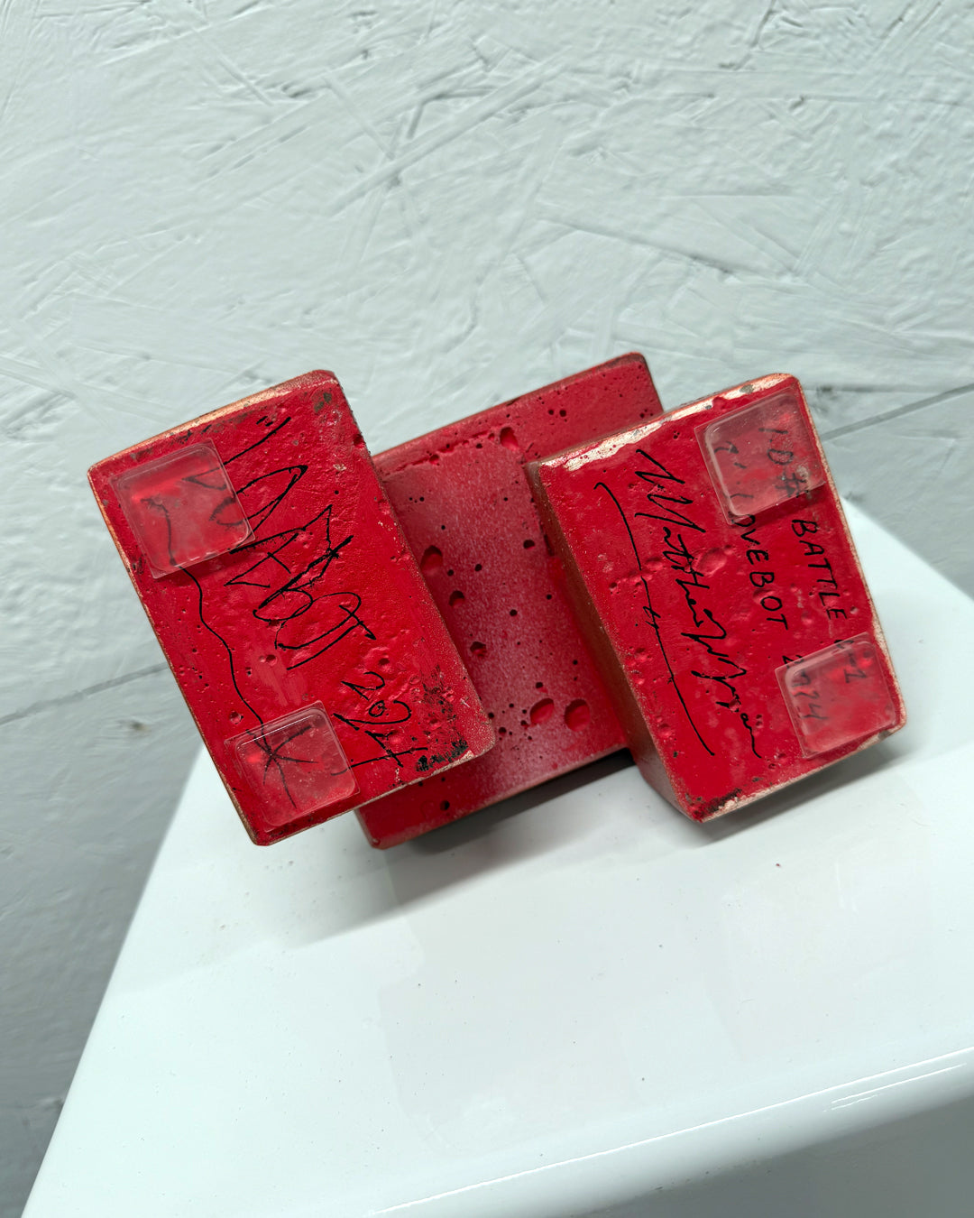 I.D # BATLE D-1 1ft Concrete Lovebot This 1/1 hand painted Concrete Lovebot Sculpture is one of the best I've ever produced. It features yellow gold and red details on an Iron...